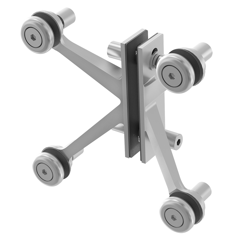 Araña baby Mérida, con portacostillas de 2 patas. Diseñada para instalación en interiores, con modulaciones de vidrio de 1.20 x 3.00m máximo. *Incluye conectores a vidrio. Espesor Para vidrio templado de 6 a 9mm de espesor