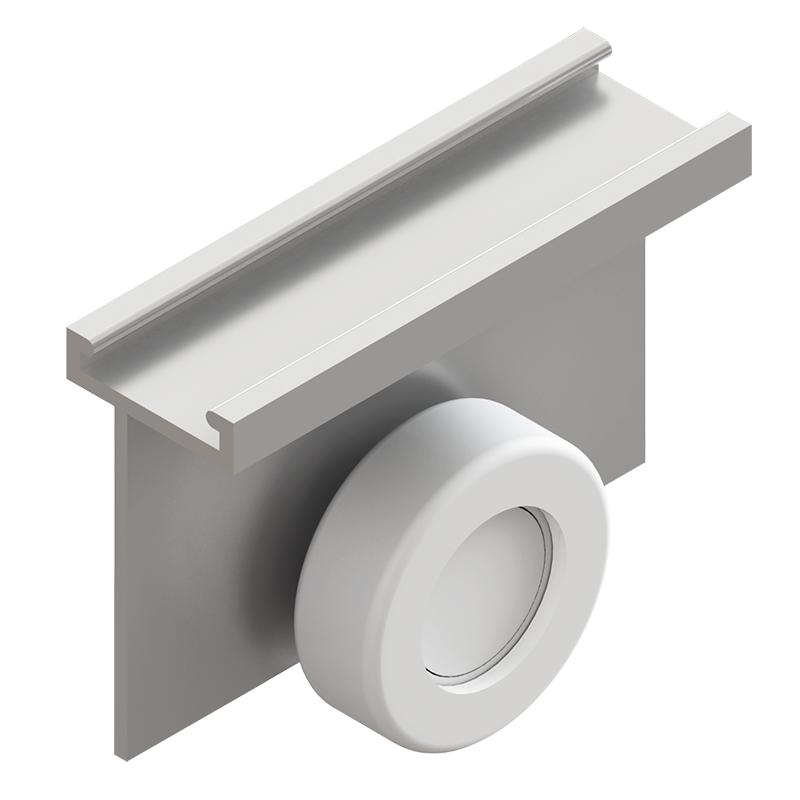 Carretilla con balero de nylon importado sencillo, de emsamble rápido y zoclo bajo. Para línea corrediza de 2”. Peso Máximo 10Kg por balero
