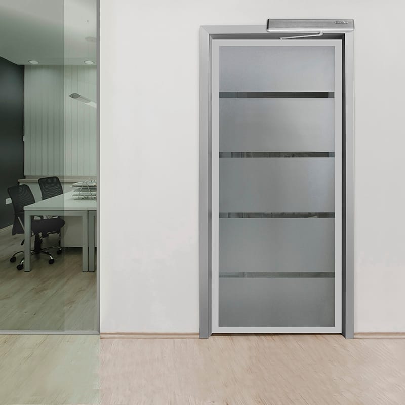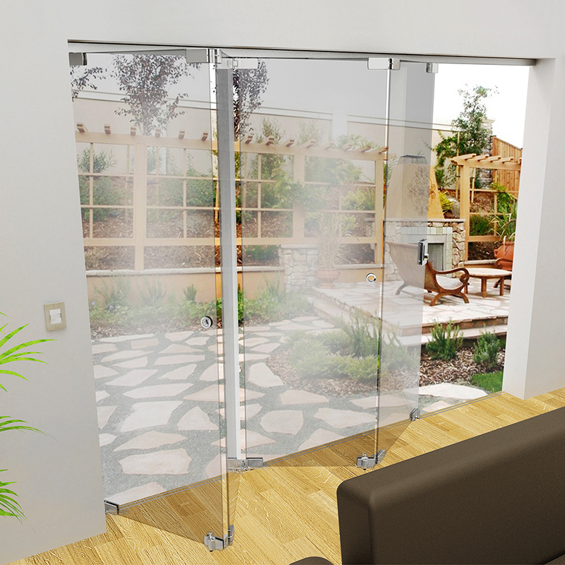 Sistema plegadizo para puertas de cristal templado, consta de un riel superior de aluminio y un perfil guía de acero inoxidable para embutir en el piso, se acompaña